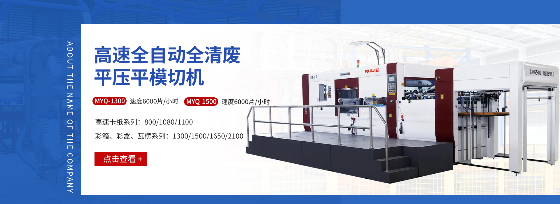 沧州瑞杰纸箱机械有限公司是一家集研发,制造,销售为一体的生产系列模切设备厂家。我们拥有现代化的机械加工设备,秉承“以质量求生存,以科技促发展”的宗旨,先进的模切技术,给广大客户带来更高的经济效益。 公司自创立以来,励精图治,锐意创新,产品规格逐渐完善,质量不断提升,市场持续扩大,产品遍布全国并出口世界102个国家。多次被评为河北省质量检验合格企业,产品质量放心企业。率先通过ISO9001:2008国际质量体系认证、欧盟CE认证,保证了产品质量的标准性和稳定性,确保更快速,便捷的为客户提供高速率,低成本,自动化,高精度的印后加工设备。 瑞杰系列模切机,以“瑞杰”“恒盛” 为注册商标。面对市场的瞬息万变和客户日益增长的需求,瑞杰人持续创新,以提高产品品质,完善服务,博采众长,精心设计,制造每一件产品,更加坚定从客户需求,客户利益出发,成为客户信赖的朋友。 Cangzhou Ruijie Carton Mac...